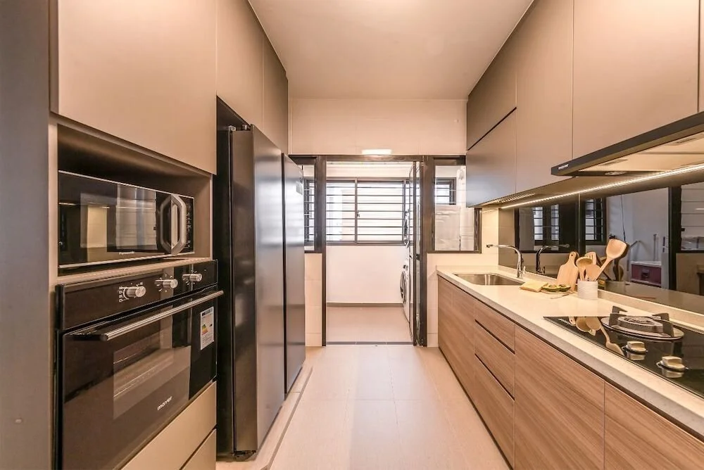 The image below shows a modern kitchen renovation, which is one of the most popular area-specific renovation packages in Singapore. It features built-in kitchen cabinets, a clean countertop, and integrated appliances, all of which are typically included in a kitchen renovation package.
